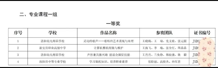 在2022年7月28日洛阳市教育局组织的2022年洛阳市中等职业学校教育教学能力大赛中,洛阳幼儿师范学校参赛的四个教师团队全部获得一等奖,其中《花球舞啦啦操》、《灵动的歌声——歌唱的艺术表现与处理》和《声形兼具激兴趣能说会演促技能》将代表洛阳市参加今年9月举行的全省职业教育教育教学能力大赛。